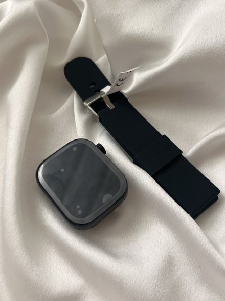 Smartwatch με μοντέρνο στυλ,λουράκι από καουτσούκ σε μαύρη και μπεζ απόχρωση,τετράγωνο καντράν full touchscreen.